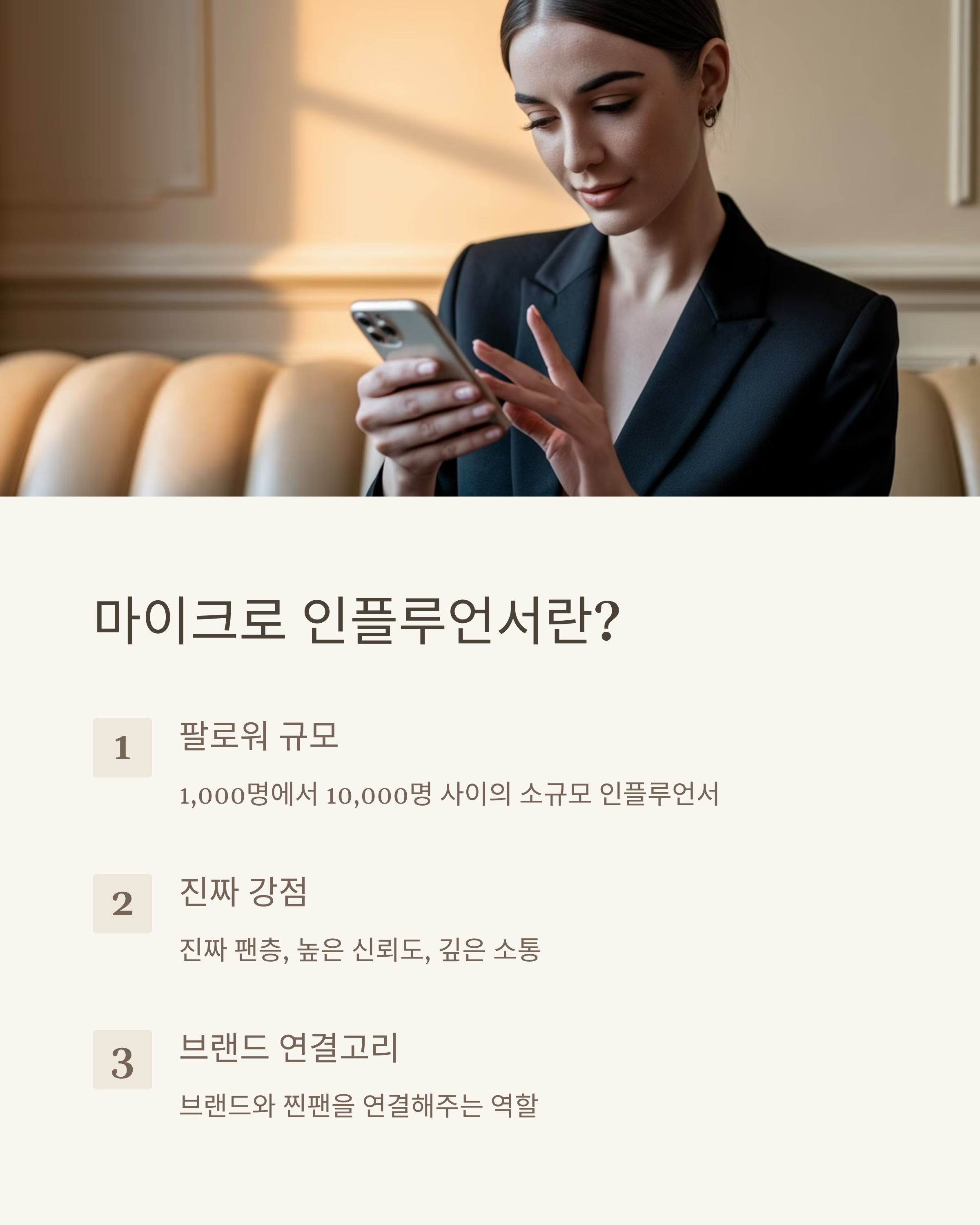 마이크로 인플루언서는 보통 팔로워 수가 1,000명에서 10,000명 사이인 소규모 인플루언서를 말합니다. 하지만 그들의 강점은 단순한 숫자가 아니라 진짜 팬층, 높은 신뢰도, 깊은 소통에 있어요. 대형 인플루언서는 광범위한 도달을 자랑하지만, 마이크로 인플루언서는 오히려 브랜드와 찐팬의 연결고리가 되어줄 수 있습니다.