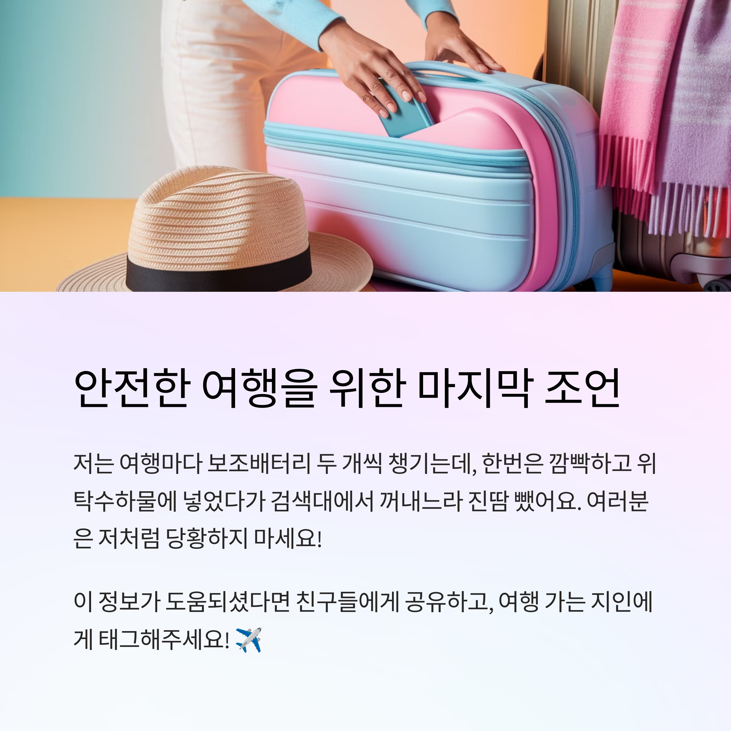 저는 여행 때마다 보조배터리 두 개씩 챙기는 타입인데요, 한번은 깜빡하고 위탁수하물에 넣었다가 검색대에서 꺼내느라 진땀 뺐던 기억이 나요.