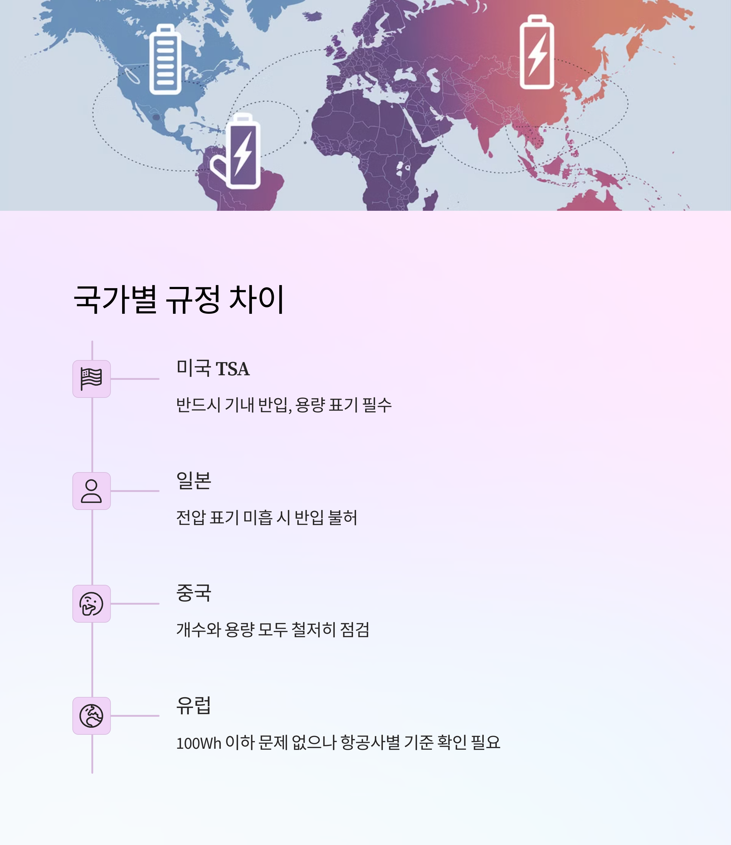 - 미국 TSA: 보조배터리는 반드시 기내 반입, 용량 표기 필수