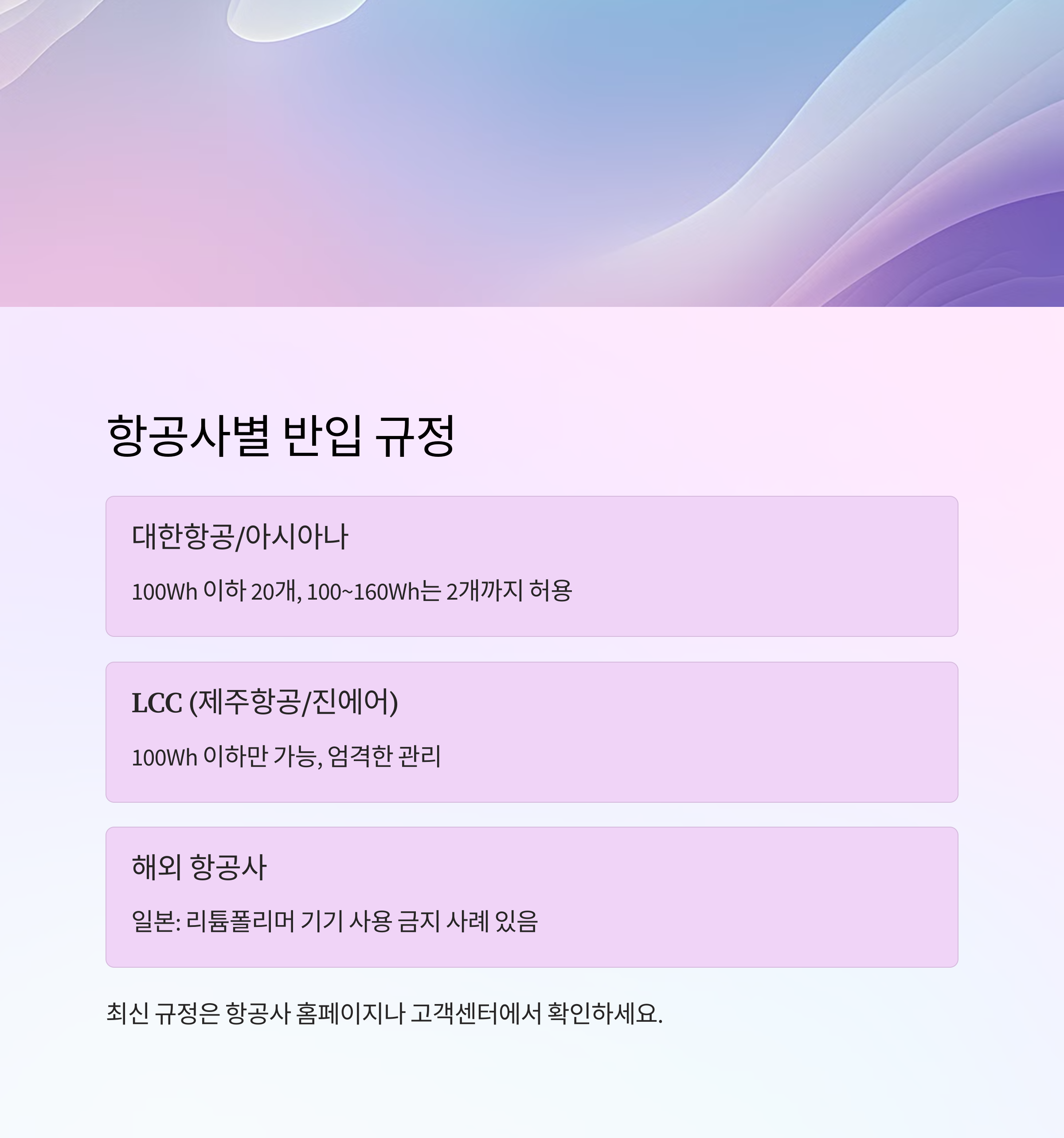 • 제주항공·진에어 등 LCC: 100Wh 이하만 가능하며 엄격한 관리