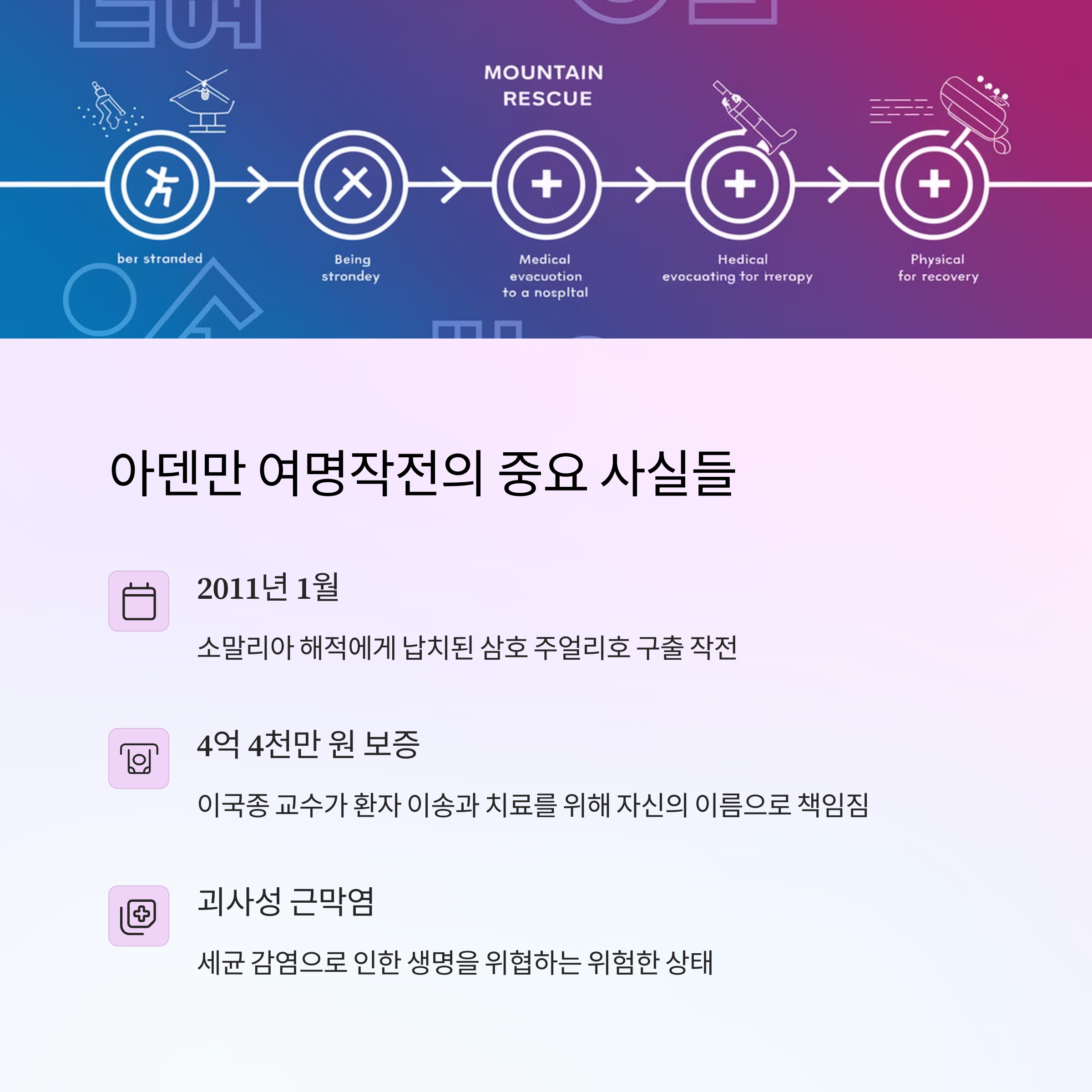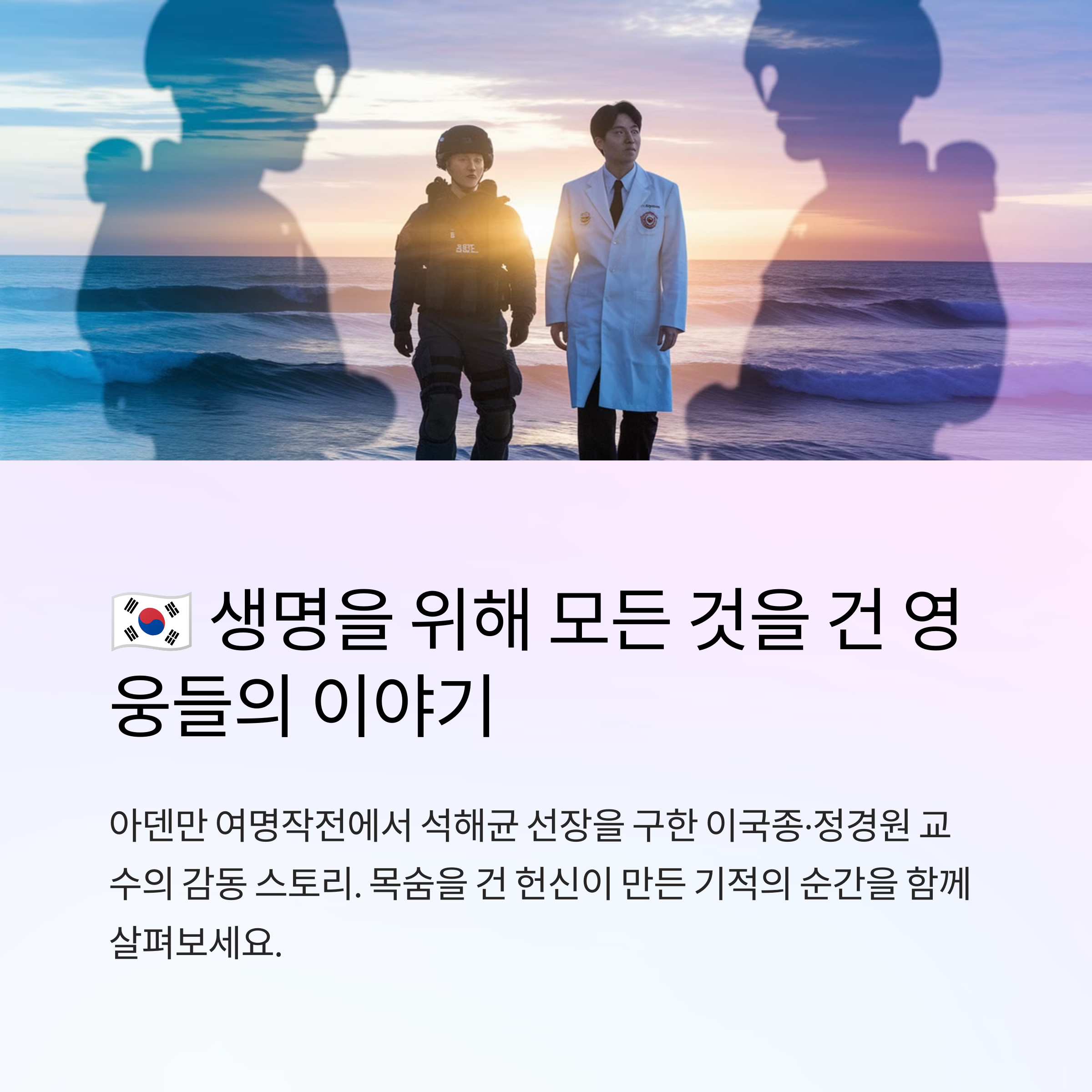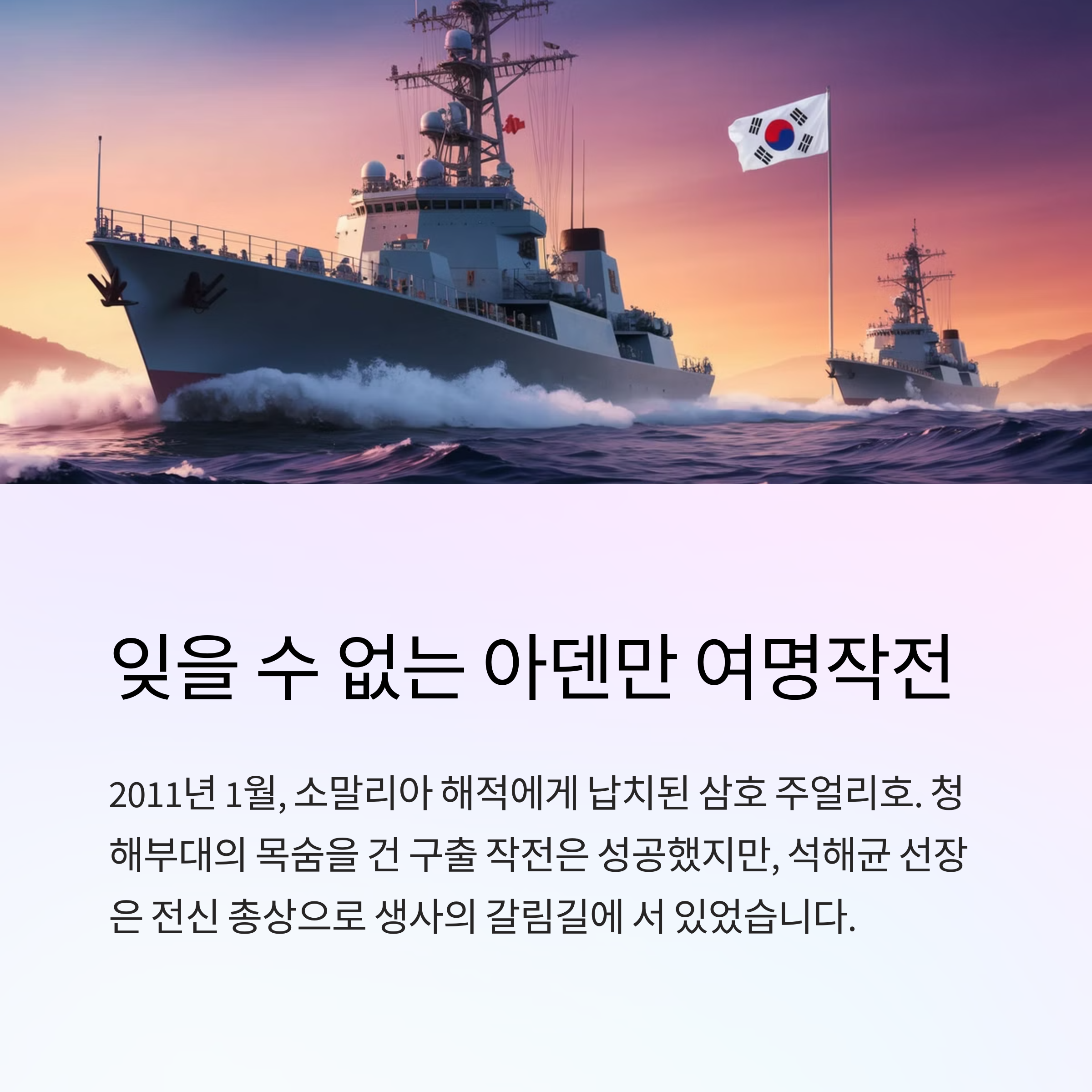 2011년 1월, TV 뉴스 속 그 장면을 잊을 수가 없습니다. 소말리아 해적에게 납치된 삼호 주얼리호. 대한민국 청해부대가 목숨을 걸고 진행한 구출 작전, 바로 ‘아덴만 여명작전’이었습니다. 작전은 성공했지만, 석해균 선장의 생명은 위태로웠습니다. 전신에 총상을 입고, 그야말로 생사의 갈림길에 서 있었죠.