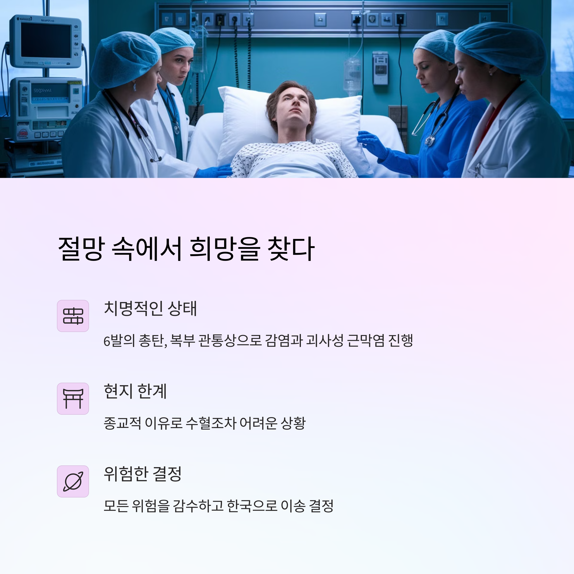 오만에 도착한 정경원 교수와 의료팀은 말로 다 할 수 없는 충격을 받았다고 합니다. 6발의 총탄이 몸을 관통했고, 특히 복부에 남은 총상은 대장과 간까지 관통해 이미 감염과 괴사성 근막염이 진행 중이었습니다. 치명률이 매우 높은 상태. 게다가 현지에서는 종교적 이유로 수혈조차 쉽지 않았습니다. 결국 의료팀은 모든 위험을 감수하고 한국으로의 이송을 결정합니다. 그 비행기 안에는 불가능에 가까운 희망 하나만이 실려 있었죠.