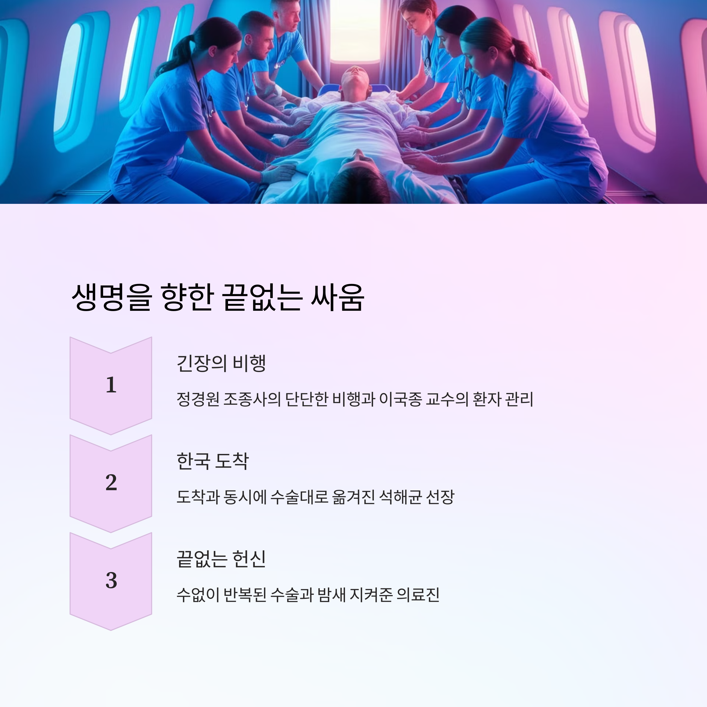 한국으로 돌아오는 길은 긴장과 기도로 가득 찼습니다. 정경원 조종사의 단단한 비행, 이국종 교수의 끝없는 환자 관리. 그 여정은 단순한 이송이 아니라 생명을 향한 싸움 그 자체였습니다. 한국 도착과 동시에 수술대 위로 옮겨진 석해균 선장. 수없이 반복된 수술과 집중 치료 속에서 의료진은 단 한 번도 포기하지 않았습니다. 누군가는 새벽에도, 누군가는 밤새 병실 곁을 지켰습니다.