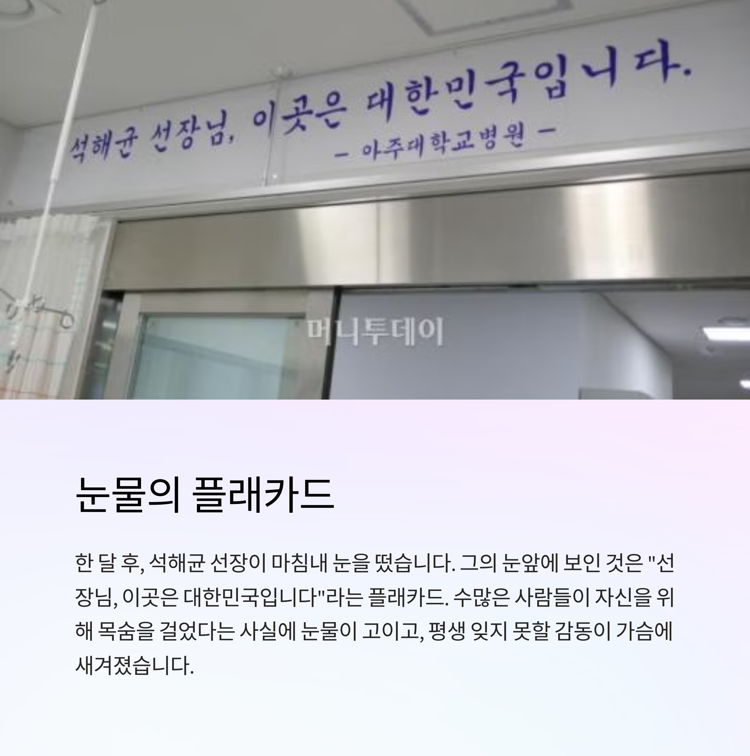 그 당시 석해균 선장은 놀라운 침착함으로 해적들의 눈을 피해 이메일을 보냈다고 합니다. “해적의 인원, 무기 상황” 등 자신이 아는 모든 정보를 담아 보내면서도, 해적들의 의심을 피하려 바둑게임을 띄워놓고 "심란해서 오락 좀 하겠다"고 말하던 순간. 모든 것이 목숨을 건 계산이었고, 결국 그 침착함 덕분에 대한민국 군함 최영함이 나타났습니다. 하지만 구출과 동시에 해적의 총탄에 쓰러진 석 선장은 기적이 필요했습니다.