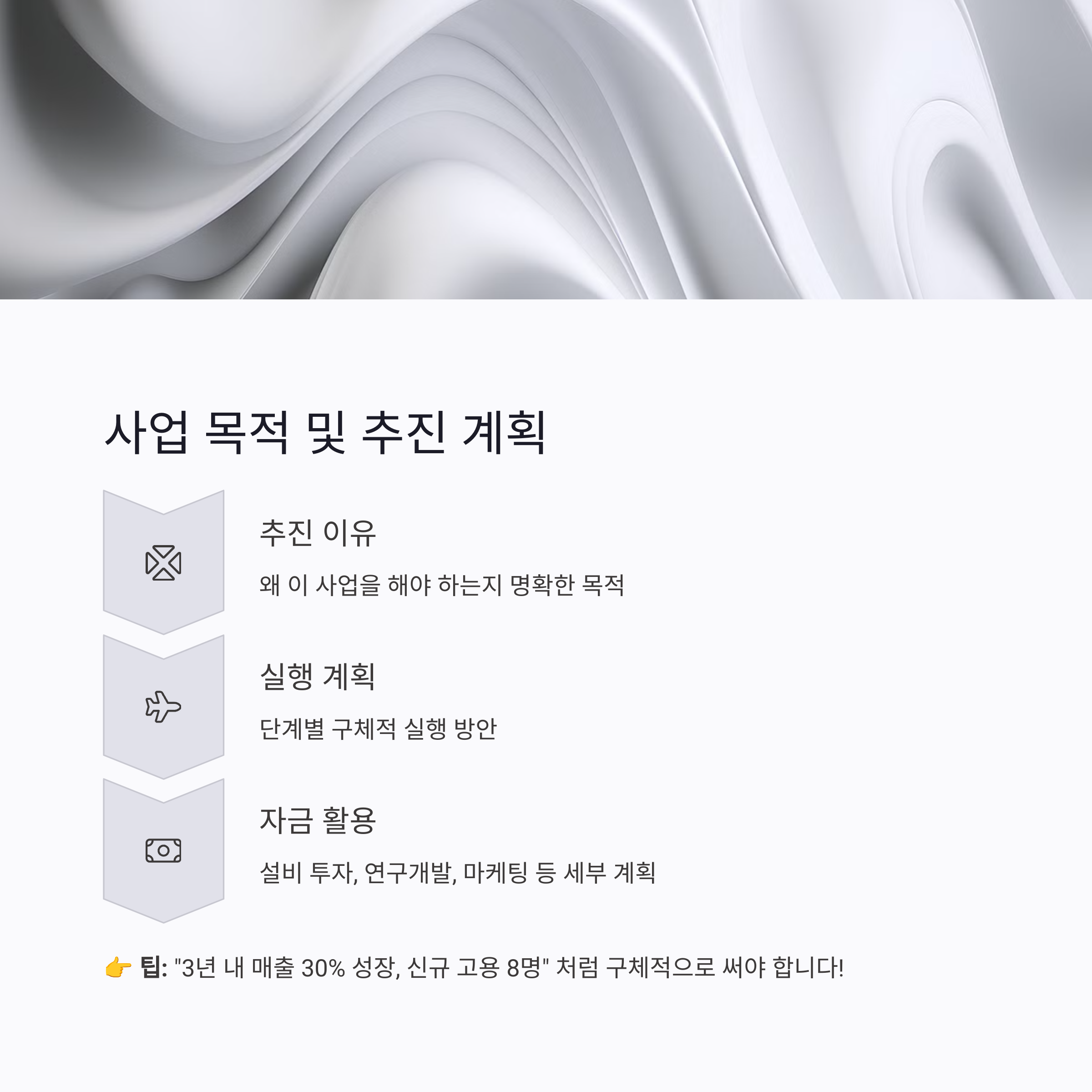 👉 팁: 단순히 "사업 잘되면 좋다"는 식으로 적으면 안 됩니다! "3년 내 매출 30% 성장, 신규 고용 8명, 해외 진출" 처럼 구체적으로 써야 심사위원들이 공감해요.