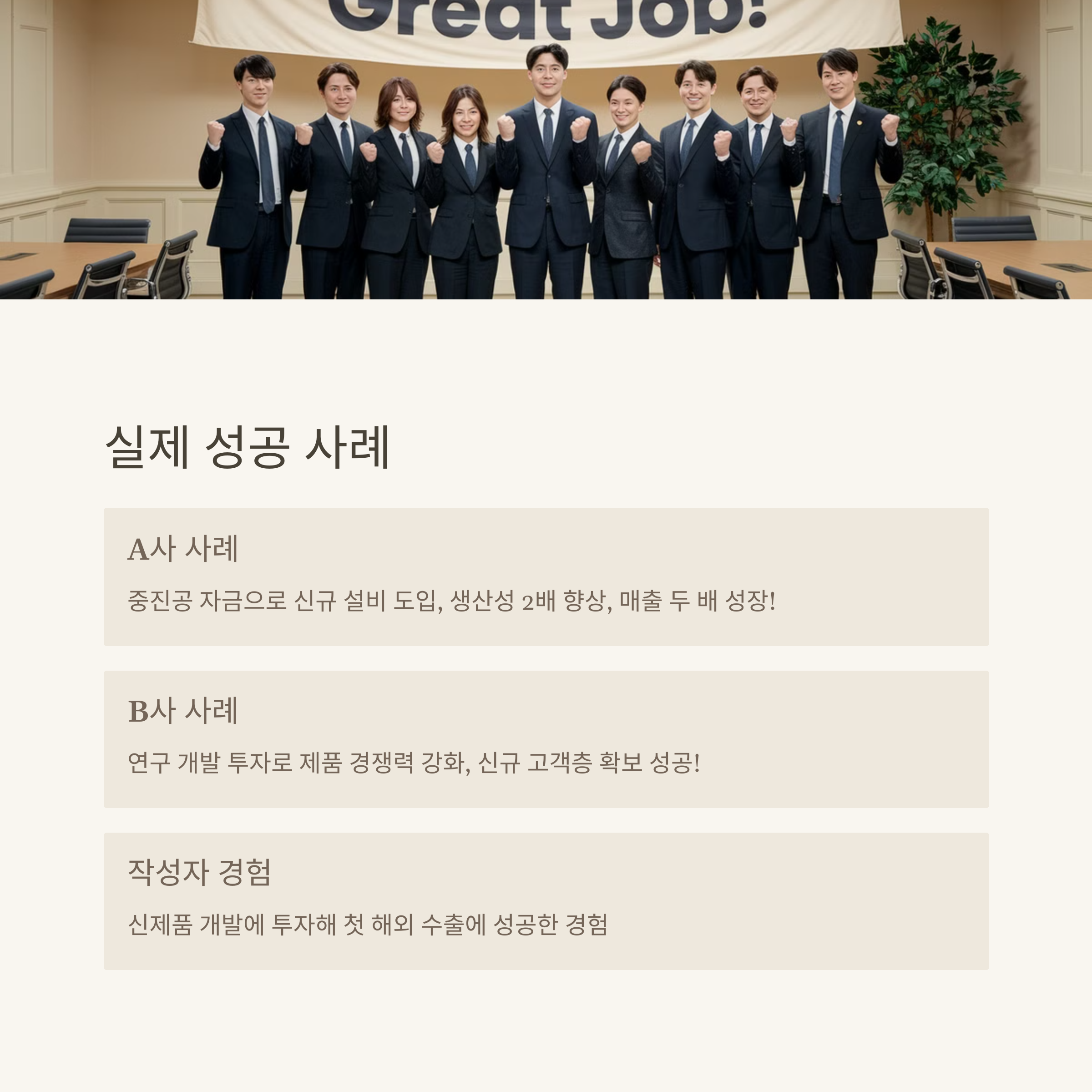 - A사: 중진공 자금으로 신규 설비를 도입해 생산성 2배 향상, 매출 두 배 성장!