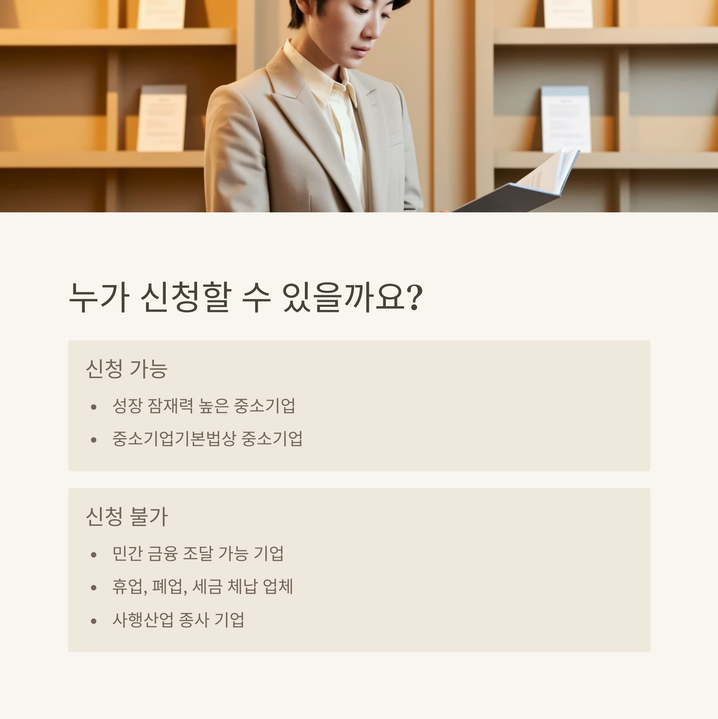 반면, 민간 금융기관에서 충분히 자금 조달 가능한 기업, 재무 문제가 있는 업체(휴업, 폐업, 세금 체납 등), 사행산업 종사 기업은 신청이 불가능해요. ❌ 저도 처음엔 무턱대고 지원했다가 부결 경험이 있었거든요. 조건 꼼꼼히 확인 필수!