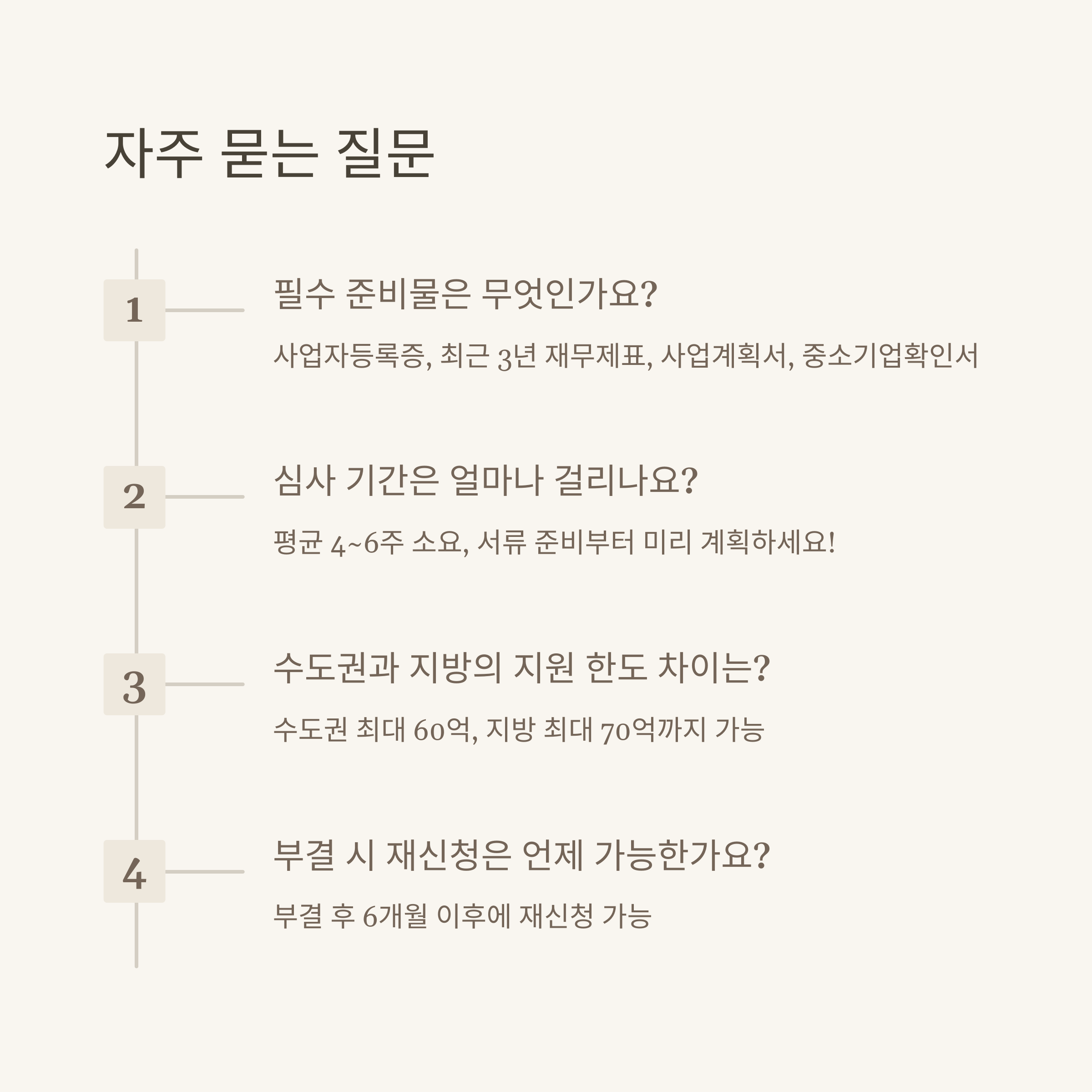 - 중진공 정책자금 신청 시 필수 준비물은 무엇인가요?사업자등록증, 최근 3년 재무제표, 사업계획서, 중소기업확인서가 필요합니다.신청 후 심사는 얼마나 걸리나요?평균 4~6주 정도 소요됩니다. 서류 준비부터 미리 계획하세요!수도권과 지방의 지원 한도 차이는 있나요?수도권은 최대 60억, 지방은 최대 70억까지 가능합니다.금리 인하 조건은 무엇인가요?포용 금융, 시설자금, 성실경영 조건 충족 시 최대 0.3%까지 금리 인하 받을 수 있습니다.부결 시 바로 재신청 가능한가요?부결되면 6개월 이후에 재신청이 가능합니다.