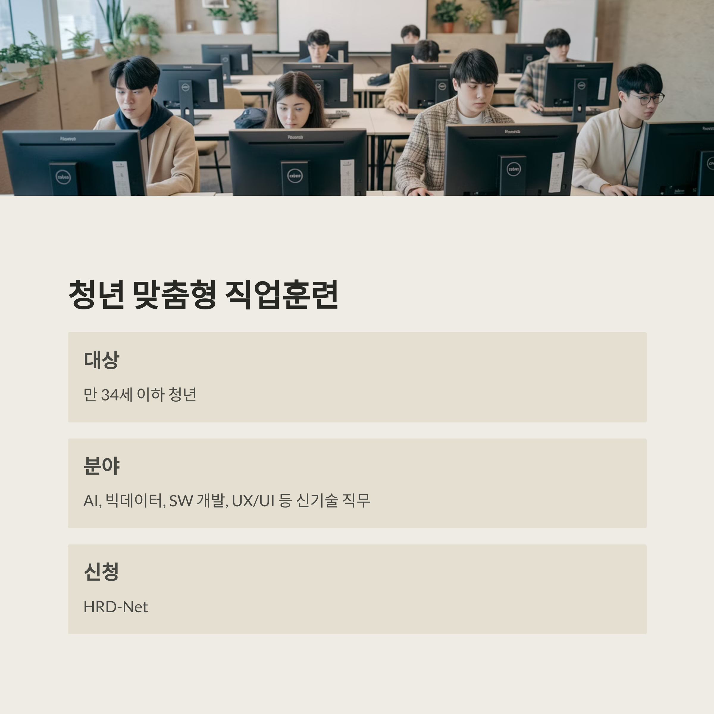 - 💻 분야: AI, 빅데이터, SW 개발, UX/UI 등 신기술 직무 과정!