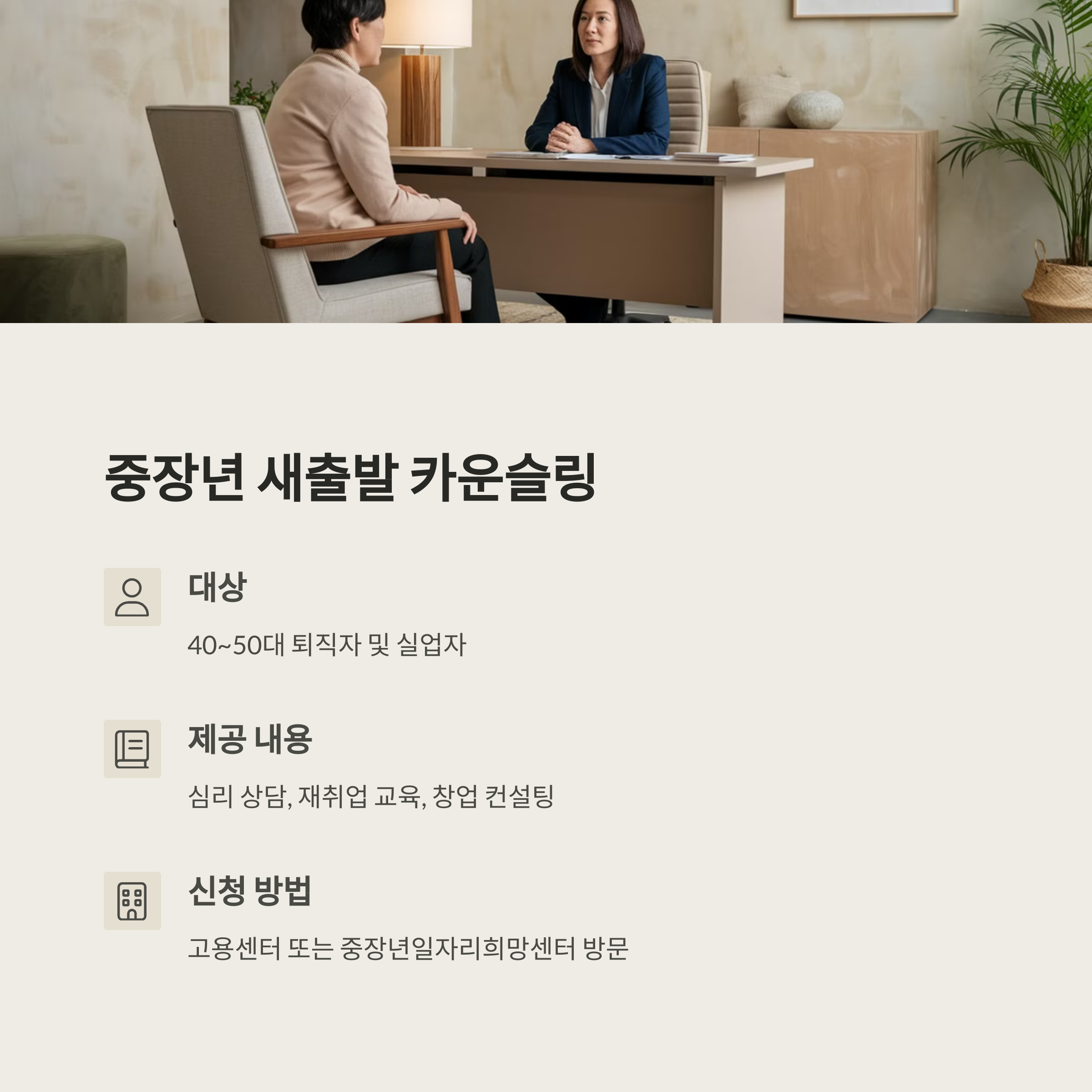 - 📚 제공 내용: 심리 상담부터 재취업 교육, 창업 컨설팅, 정부 지원 일자리 정보까지!
