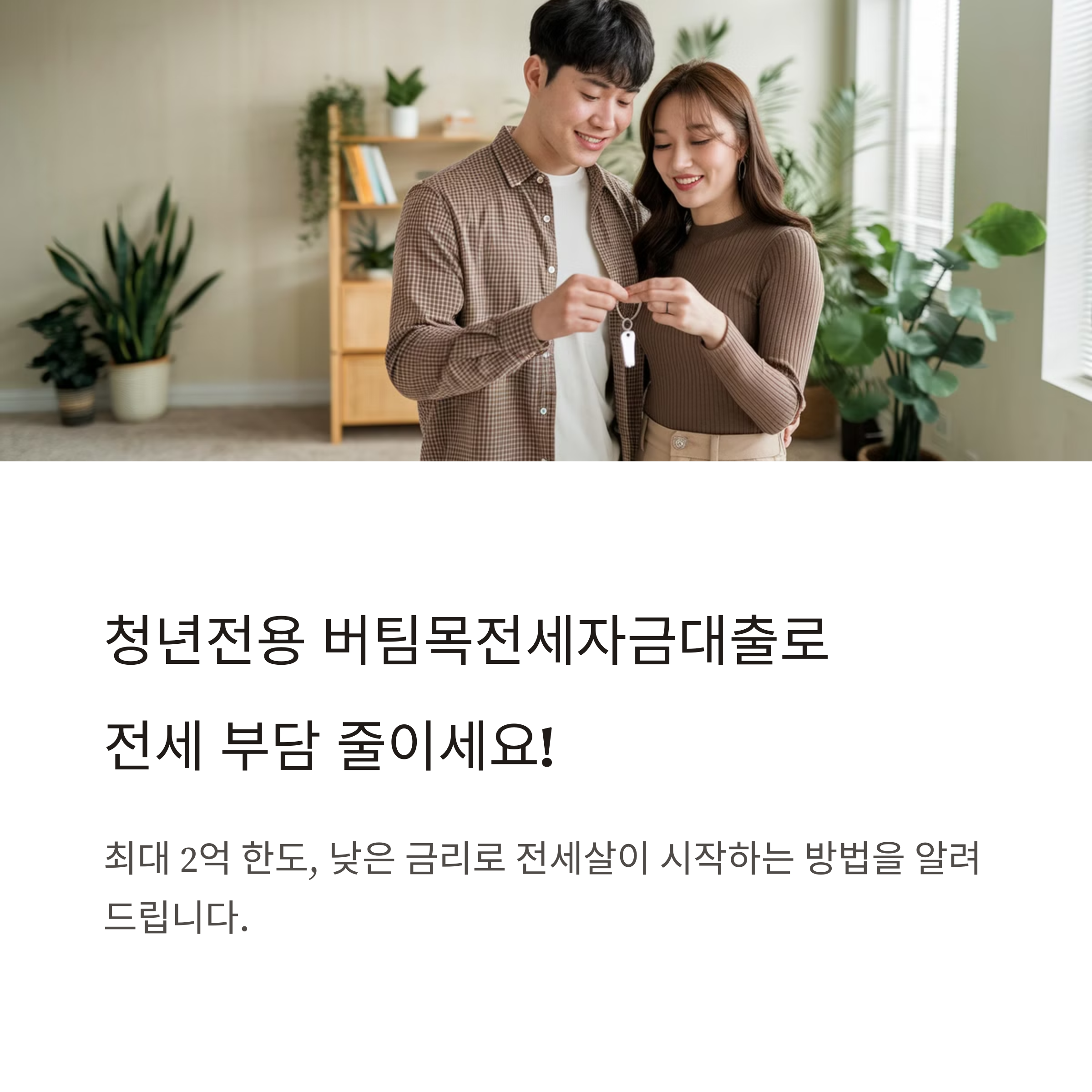 요즘 청년들이 집 구하는 건 진짜 하늘의 별 따기죠. 월세는 나갈 때마다 아까운 돈 같고, 전세는 목돈이 없으니 부담스럽고…😓 그래서 정부가 마련한 이 '청년전용 버팀목전세자금대출'은 단순한 금융상품 그 이상이에요. 안정된 주거 환경을 만들어주려는 정책자금이니까요.