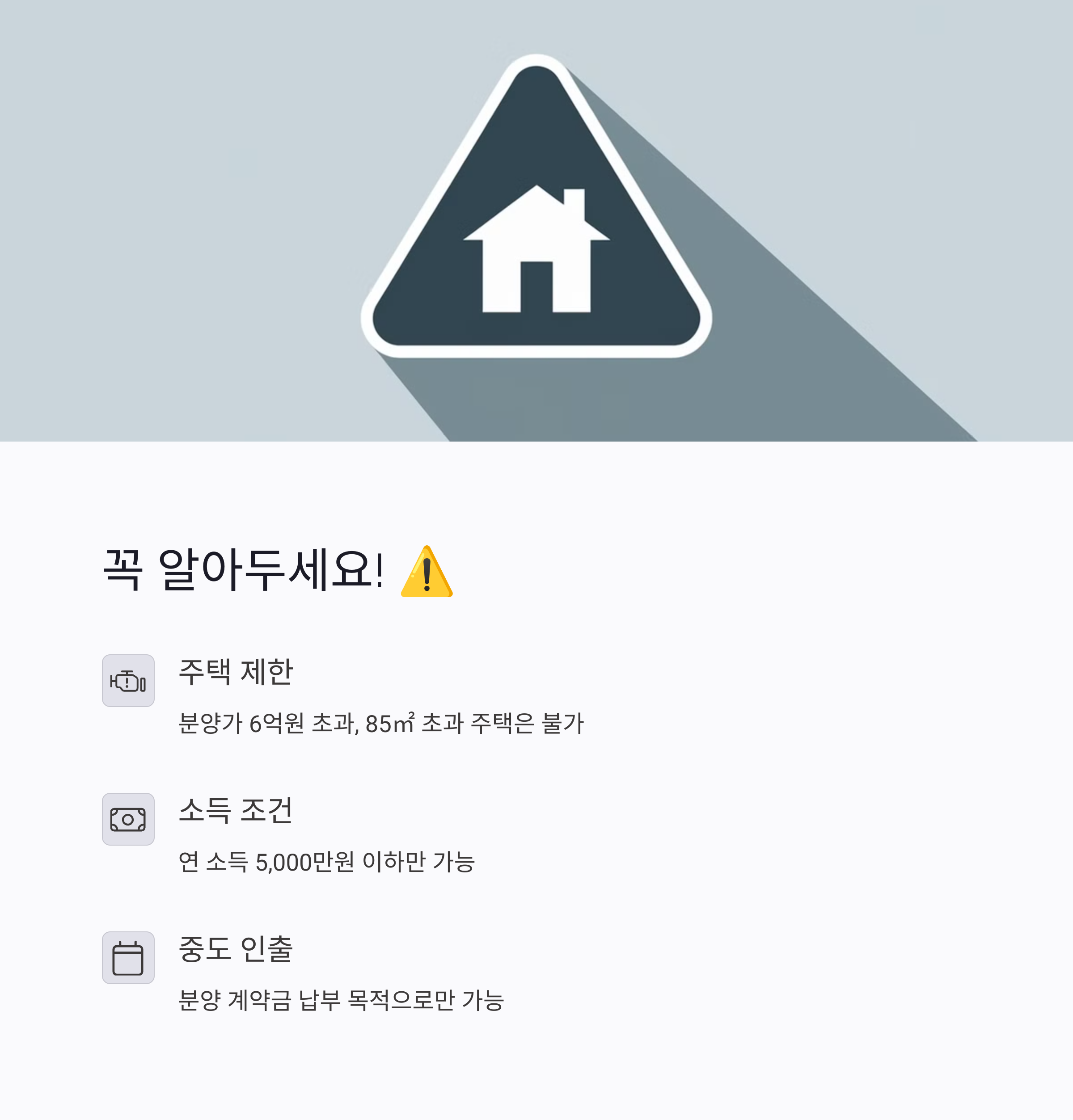 - 대상 주택 제한: 분양가 6억 원 초과, 전용면적 85㎡ 초과 주택 불가