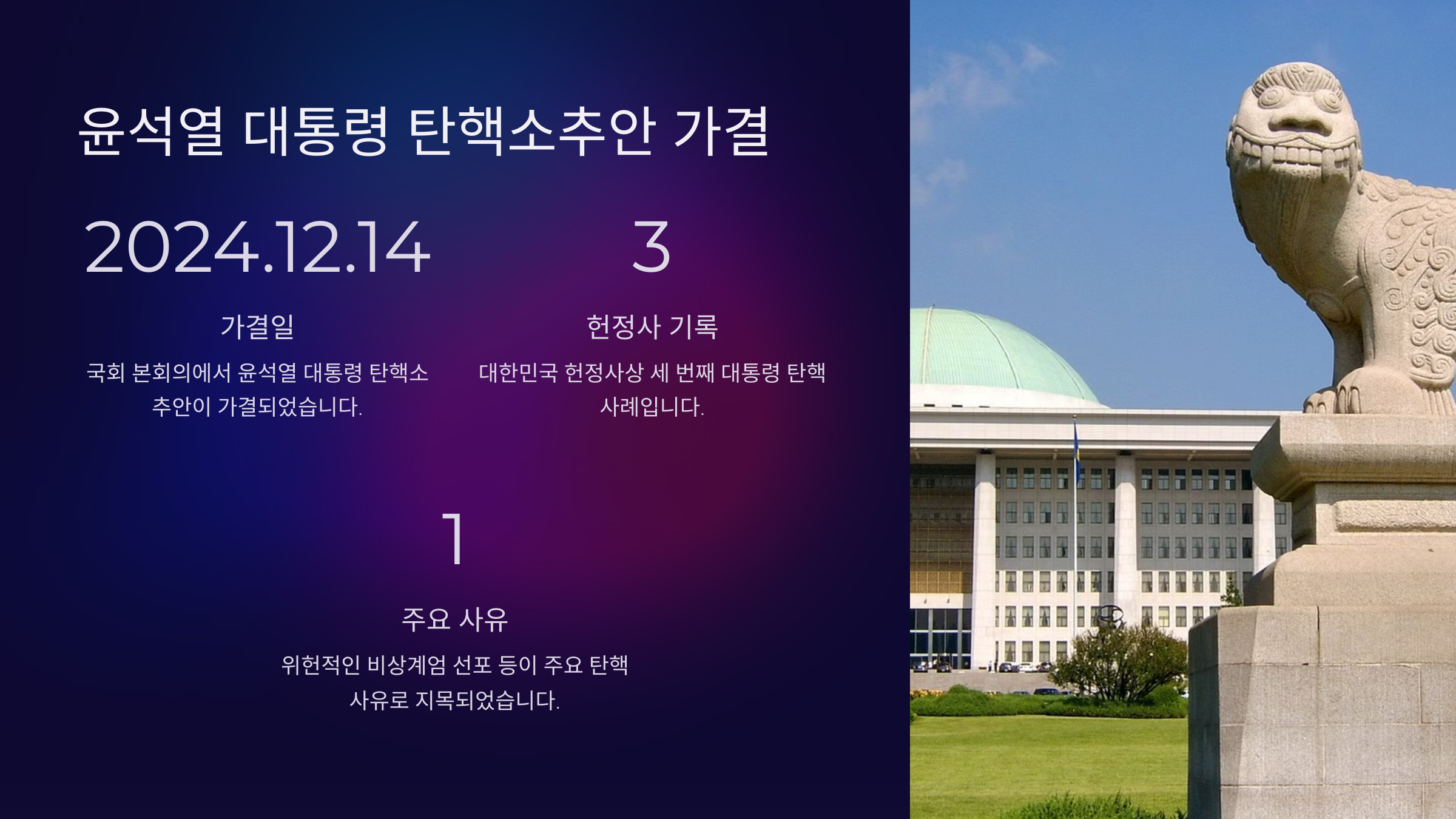 2024년 12월 14일, 국회 본회의에서 윤석열 대통령에 대한 탄핵소추안이 가결되었습니다. 이는 대한민국 헌정사상 세 번째 대통령 탄핵 사례로 기록되었으며, 주요 탄핵 사유로는 위헌적인 비상계엄 선포 등이 지목되었습니다.