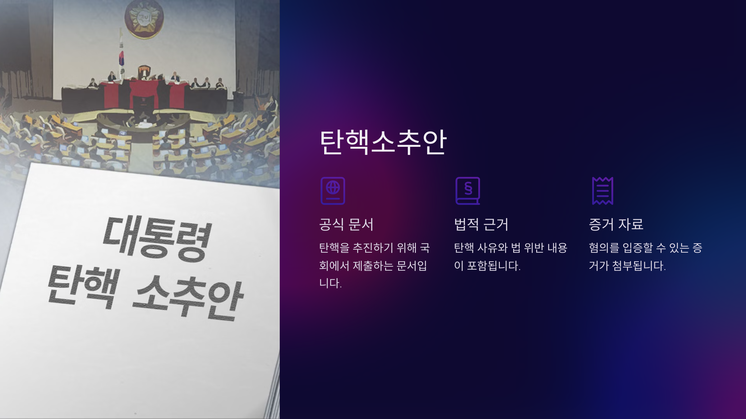 탄핵을 추진하기 위해 국회에서 공식적으로 제출하는 문서입니다. 탄핵 사유, 법 위반 내용, 증거 등이 포함됩니다.