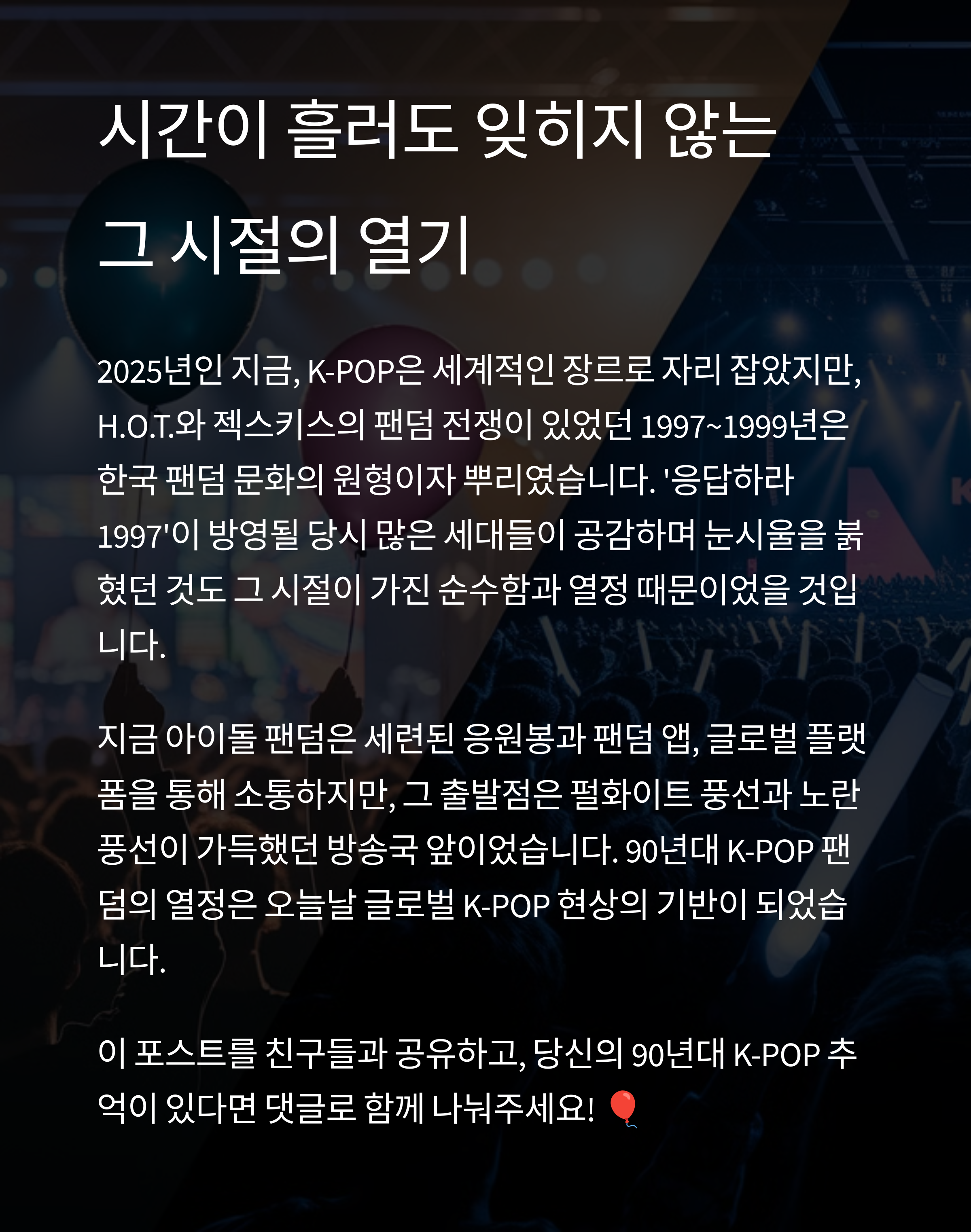 2025년인 지금, K-POP은 세계적인 장르로 자리 잡았습니다. 그러나 H.O.T.와 젝스키스의 팬덤 전쟁이 있었던 1997~1999년은 한국 팬덤 문화의 원형이자 뿌리였습니다. '응답하라 1997'이 방영될 당시 많은 세대들이 공감하며 눈시울을 붉혔던 것도 그 시절이 가진 순수함과 열정 때문이었겠죠.