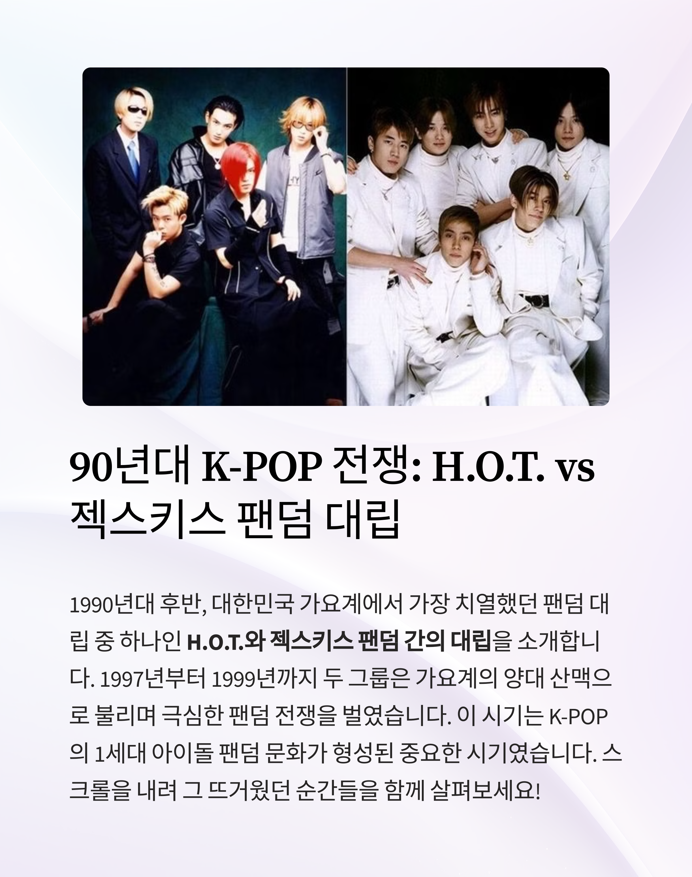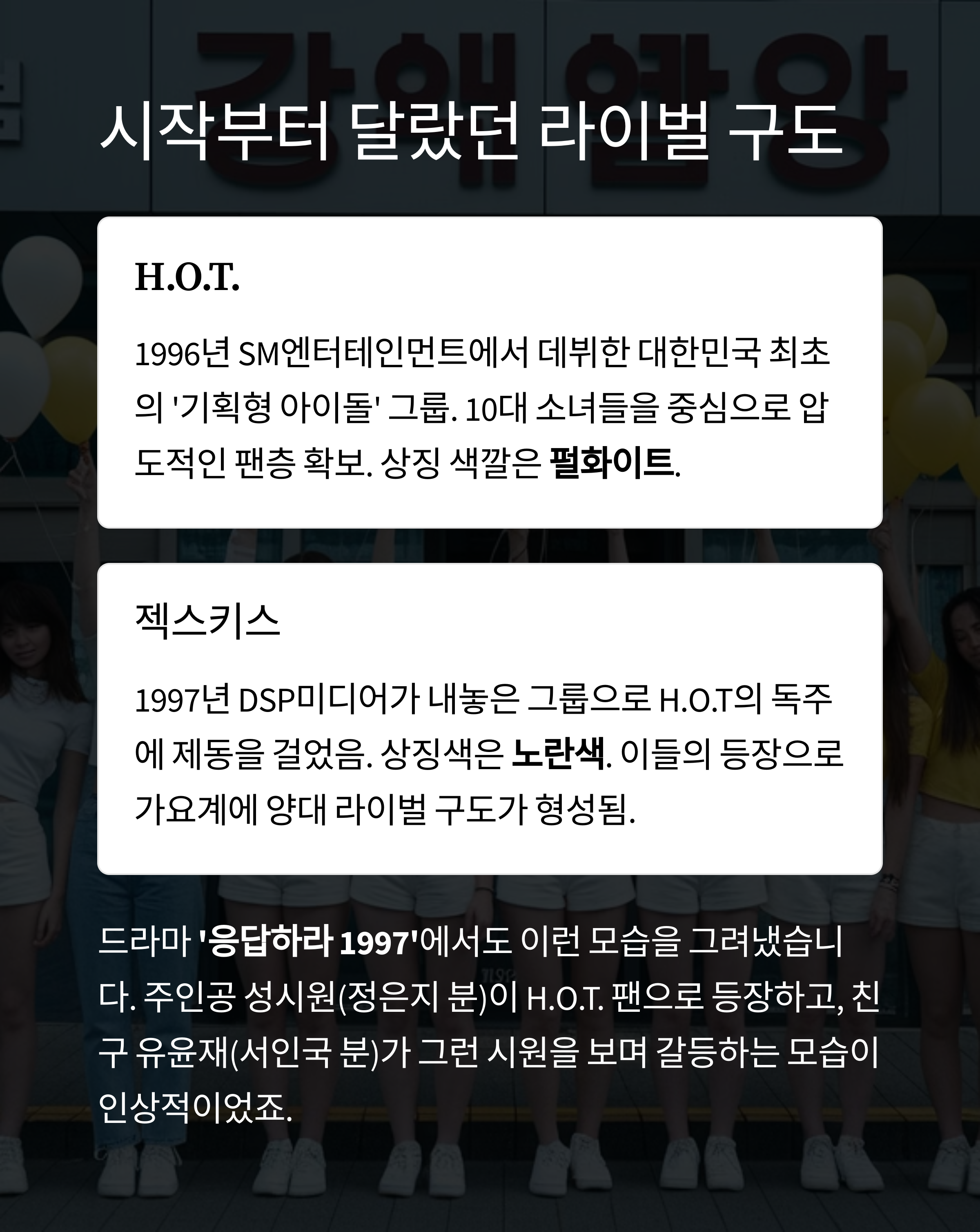 안녕하세요! 오늘은 1990년대 후반, 대한민국 가요계에서 가장 치열했던 팬덤 대립 중 하나인 H.O.T.와 젝스키스 팬덤 간의 대립 이야기를 해보려고 합니다. 특히 1997년부터 1999년까지 두 그룹은 가요계의 양대 산맥으로 불리며, 단순한 인기 경쟁을 넘어선 극심한 팬덤 전쟁을 벌였습니다. 이 시기는 K-POP의 1세대 아이돌 팬덤 문화가 형성된 시기이기도 한데요, 많은 분들이 2012년 방영된 드라마 '응답하라 1997'에서도 이 뜨거운 팬덤 경쟁 장면을 떠올리실 것 같습니다. 저 역시 그 드라마를 보면서 당시의 열기를 다시 느꼈는데요, 그때의 기억과 1세대 팬덤 문화의 시작과 특징에 대해 블로그 형식으로 길게 풀어보겠습니다.