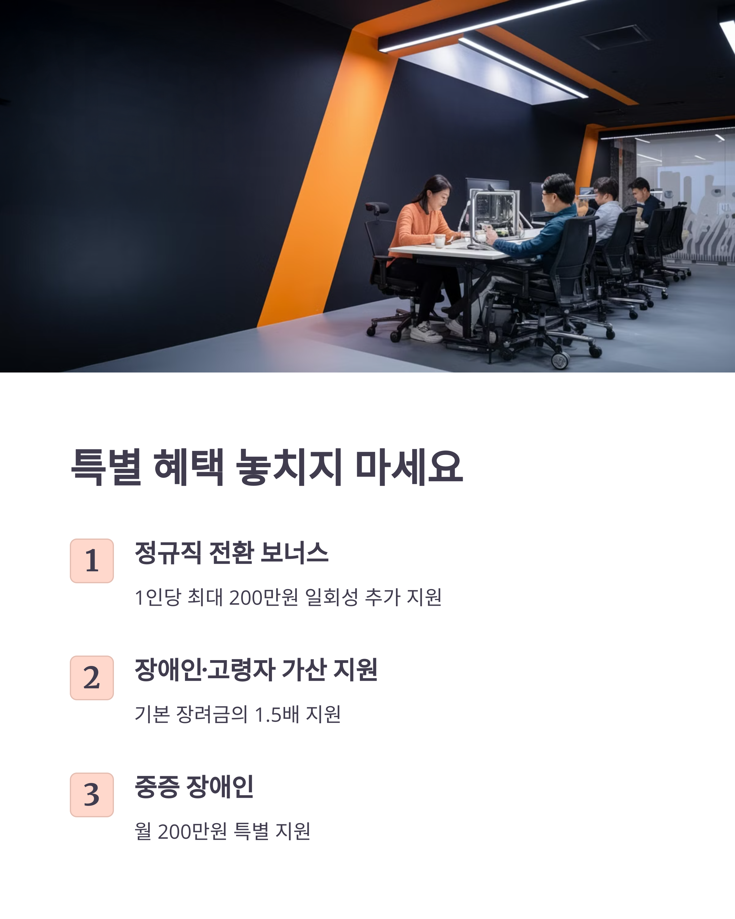 - 비정규직→정규직 전환 시 장려금 신설: 1인당 최대 200만 원 일회성 추가 지원