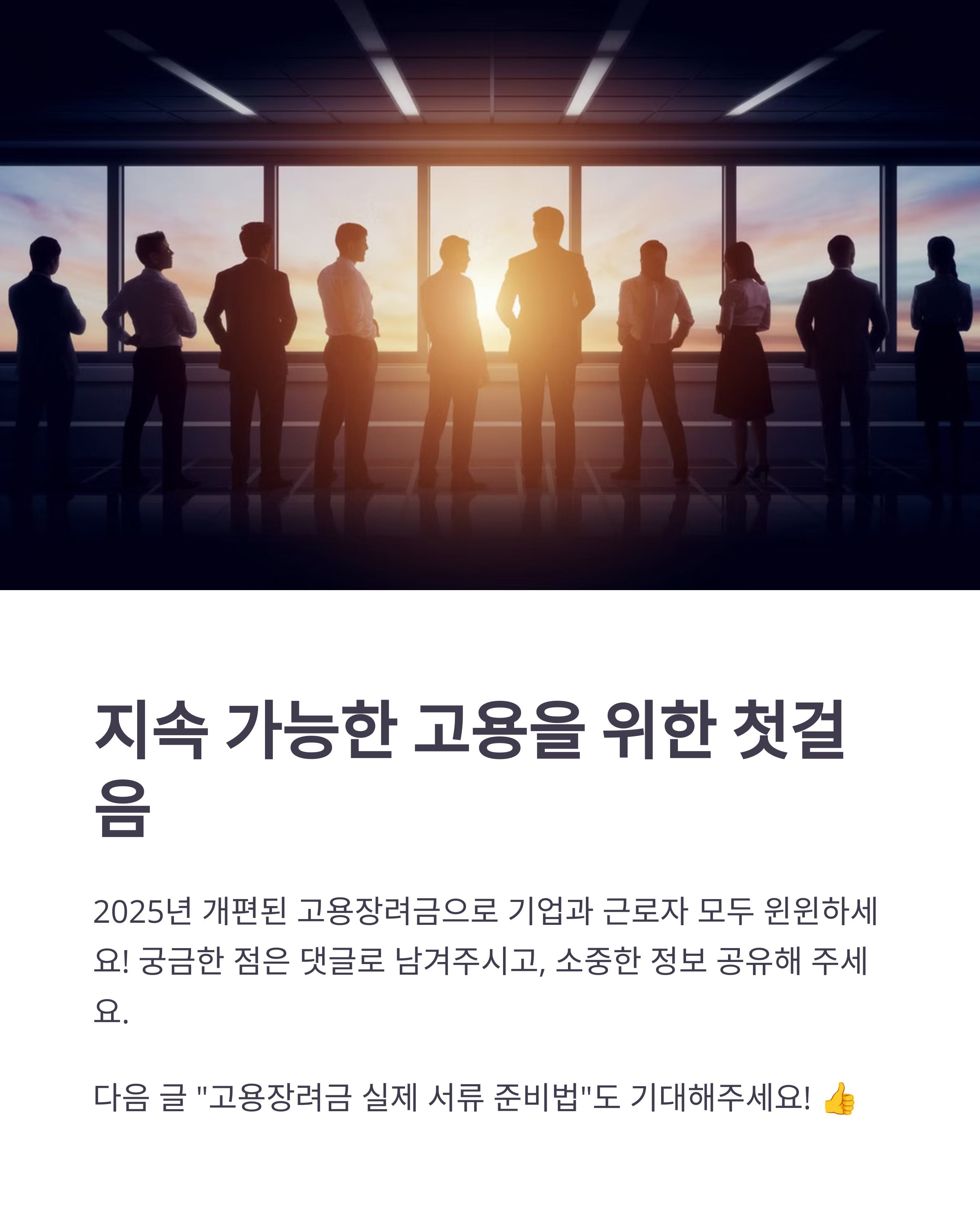 2025년 고용장려금은 단순한 지원을 넘어 지속 가능한 고용, 좋은 일자리 창출을 위한 중요한 제도입니다. 올해 개편된 기준을 잘 숙지하셔서 꼭 혜택 받으시길 바랍니다! 다음에는 "고용장려금 실제 서류 준비법"으로 돌아올게요! 💪