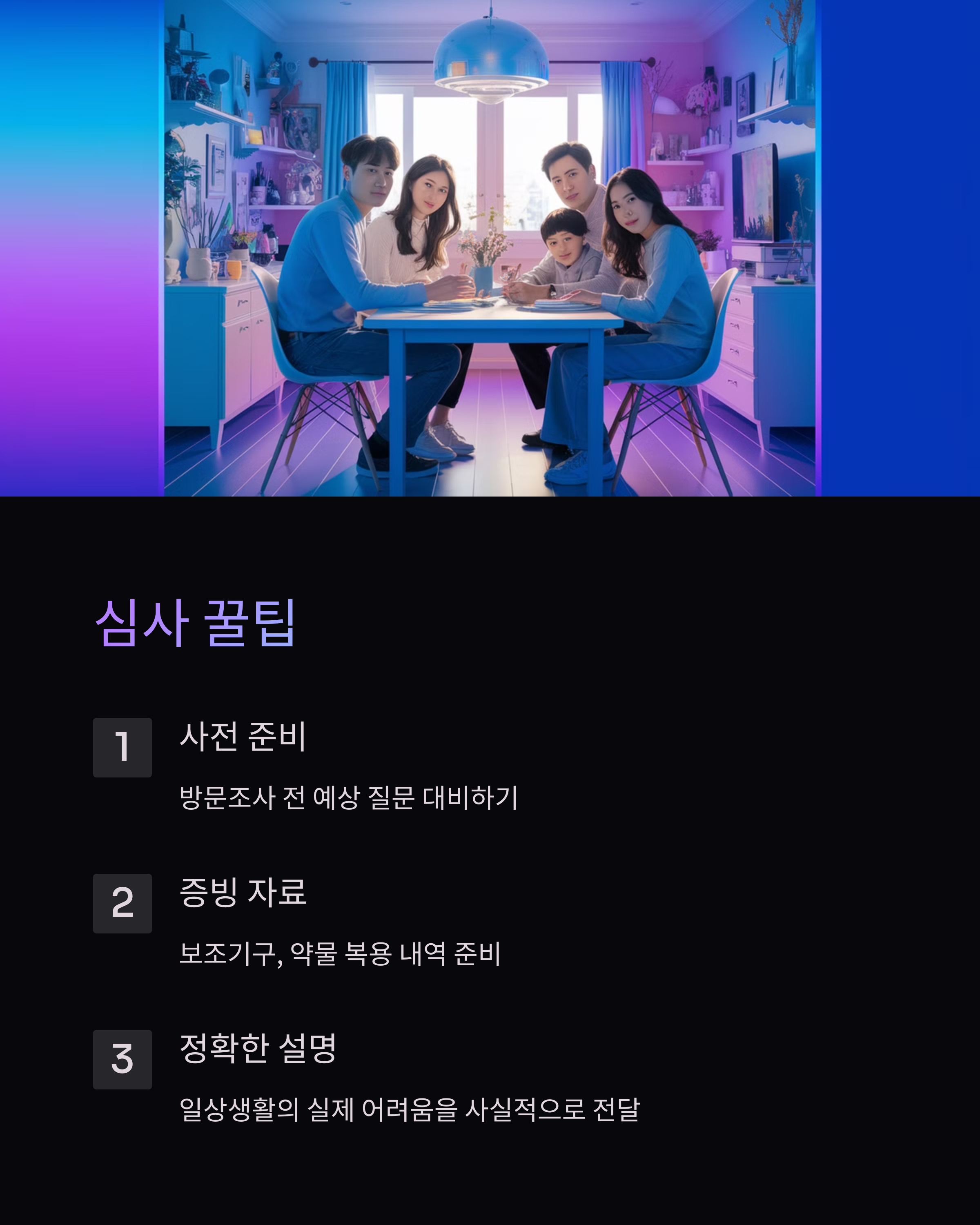 • 방문조사 전에는 보호자와 미리 예상 질문 대비하기 (일상생활 어려움 설명 준비)