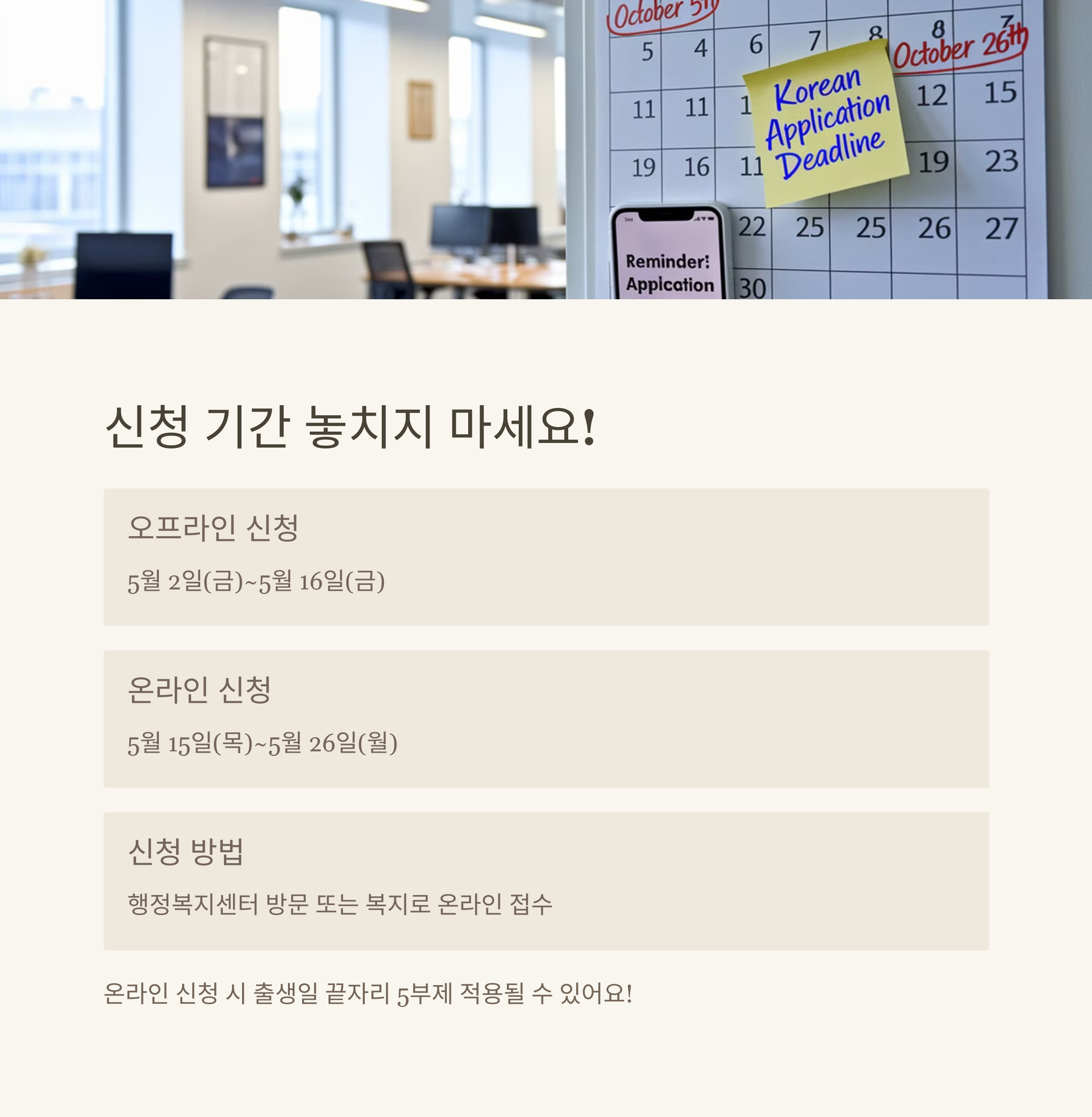✅ 온라인 신청(복지로): 5월 15일(목)부터 5월 26일(월)까지