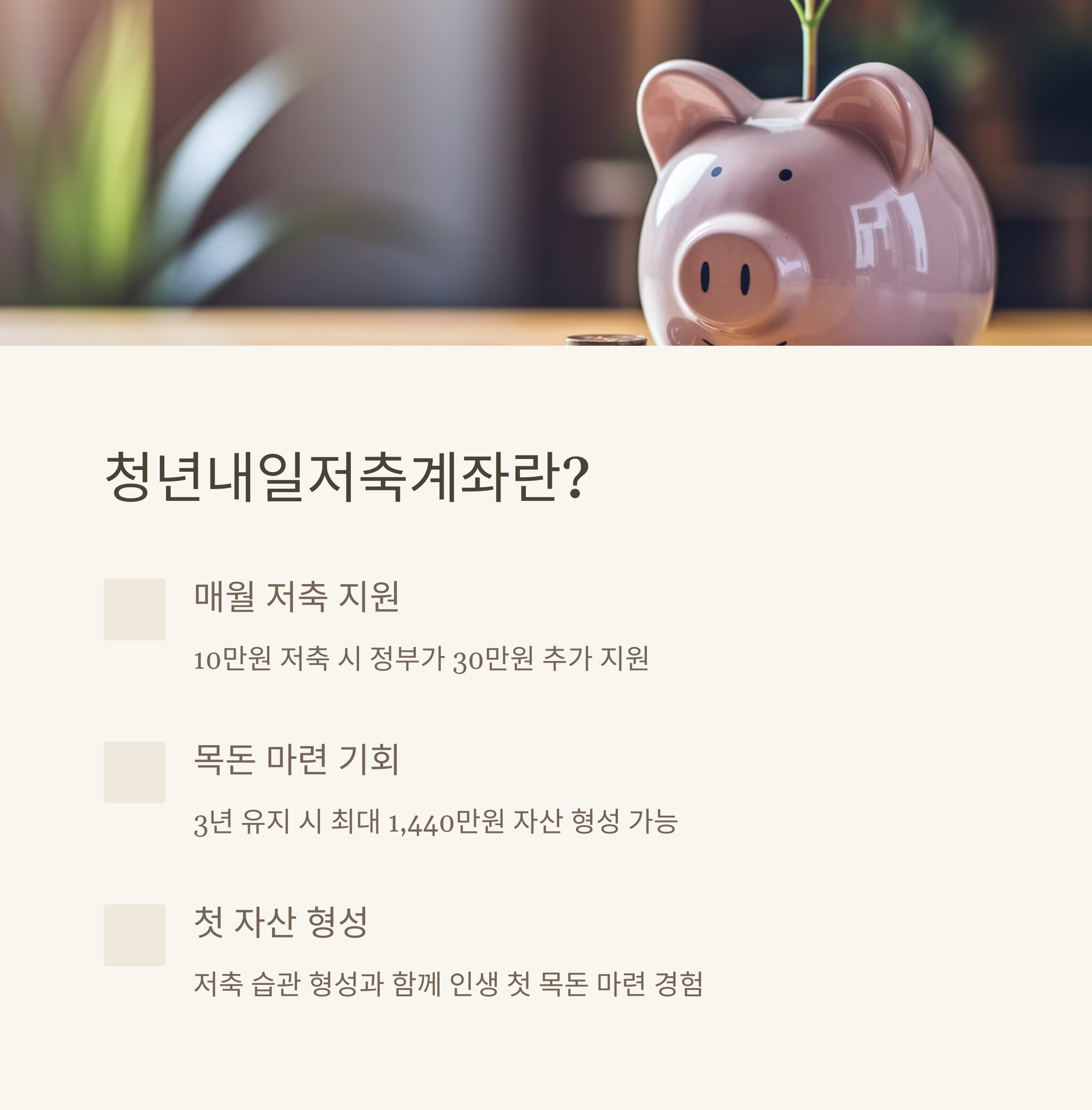 청년내일저축계좌는 일정 소득 이하의 청년이 매달 저축하면 정부가 추가 지원금을 얹어주는 제도예요. 매달 10만원 저축 시 30만원까지 지원! 🎉 3년 동안 꾸준히 유지하면 최대 1,440만 원의 자산을 만들 수 있어요. 저도 이 제도로 처음으로 목돈을 만들어봤는데, 정말 뿌듯하더라고요.