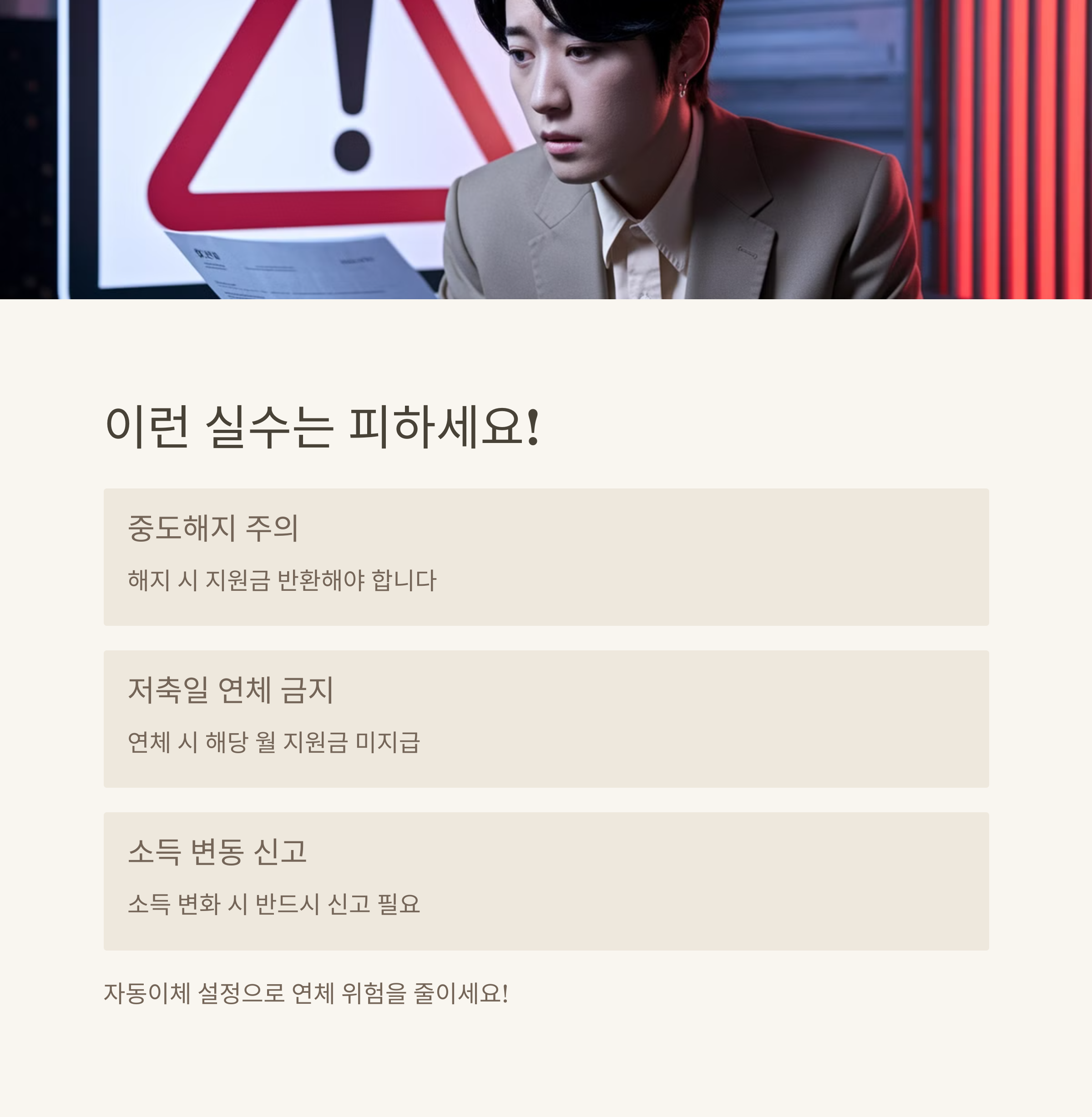 - 저축일 연체 시 해당 월 지원금 미지급 (자동이체 필수!)