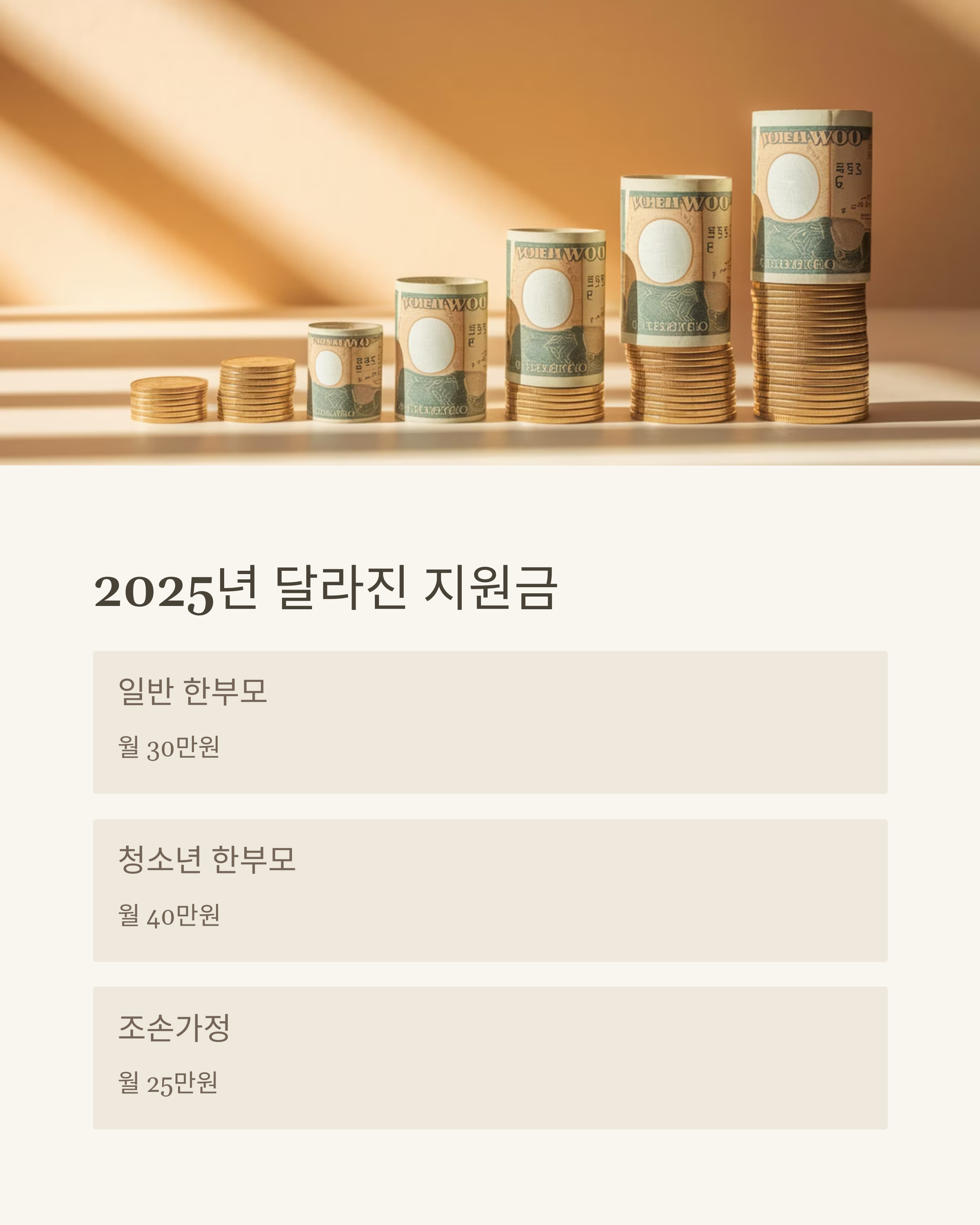 2025년부터 양육비 지원이 크게 확대되었습니다. 정부 발표에 따르면, 양육비 최대 40만 원까지 인상되며 특히 청소년 한부모, 조손 가정에 대한 추가 지원이 강화되었어요. 💰